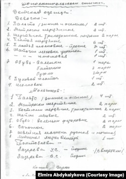 Бул документте үйдөгү буюм-тайымдардан тартып, балдарынын кийим-кечесине чейин конфискацияланганы тизмектелген.